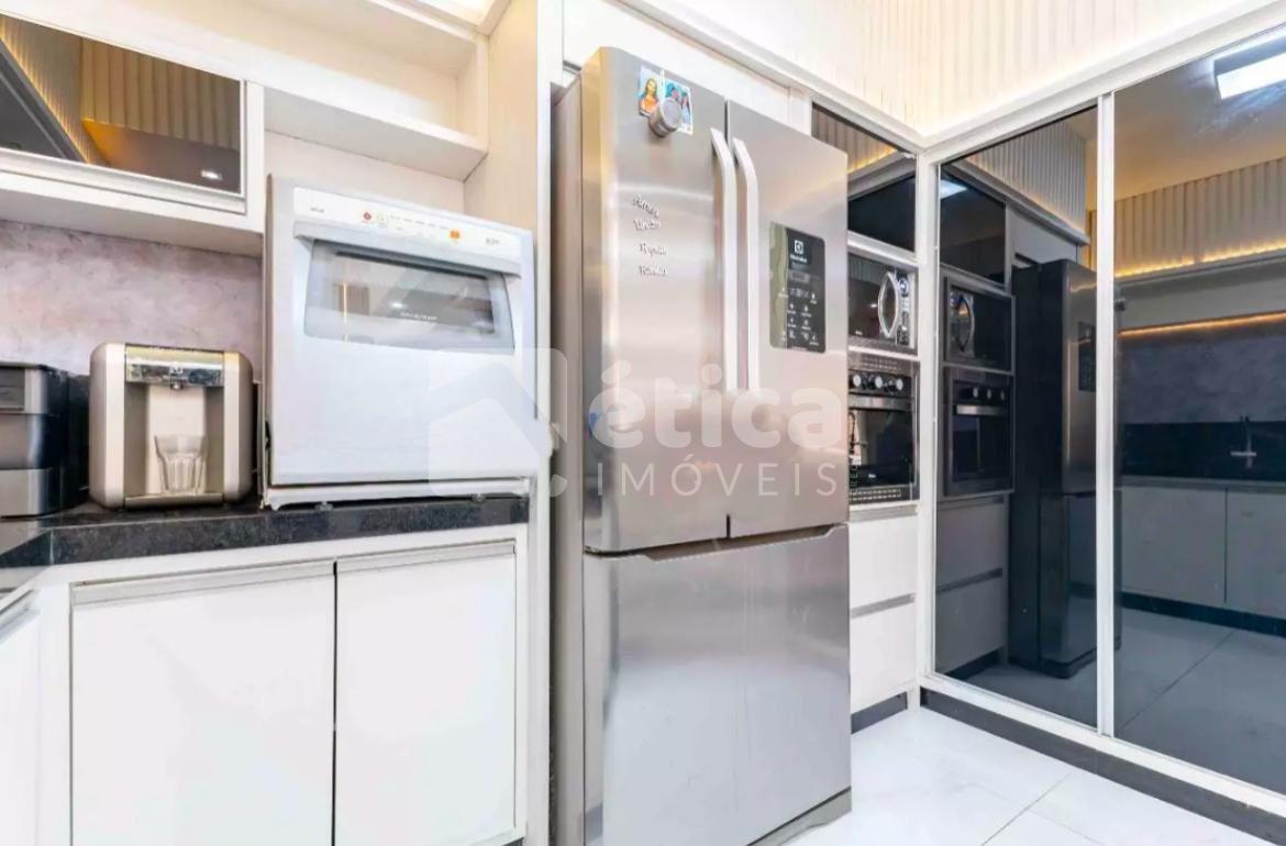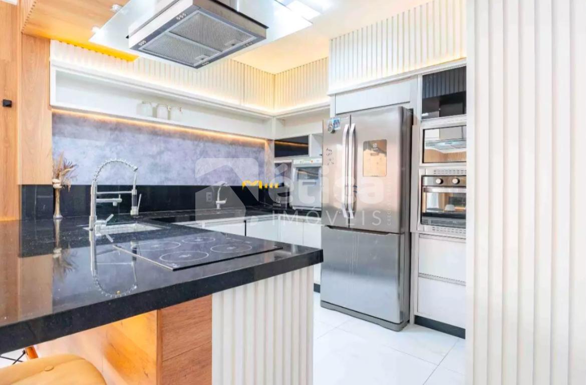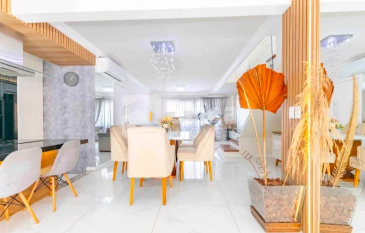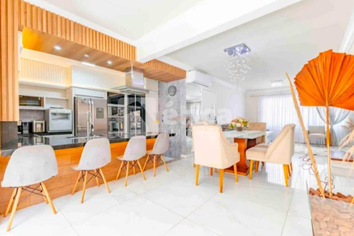 No térreo, o imóvel se destaca pela cozinha integrada às salas de estar e jantar, proporcionando praticidade e interação entre os ambientes.