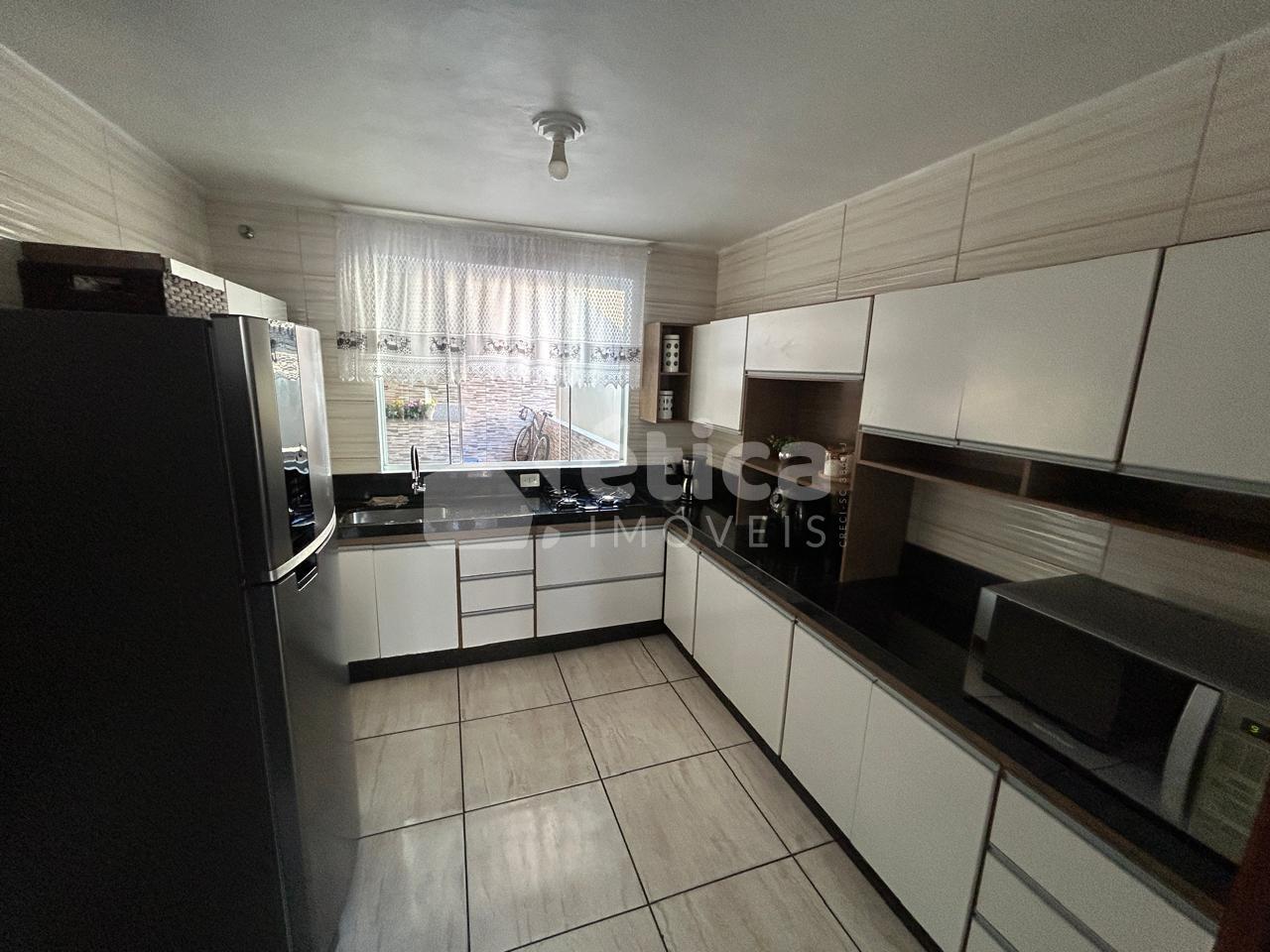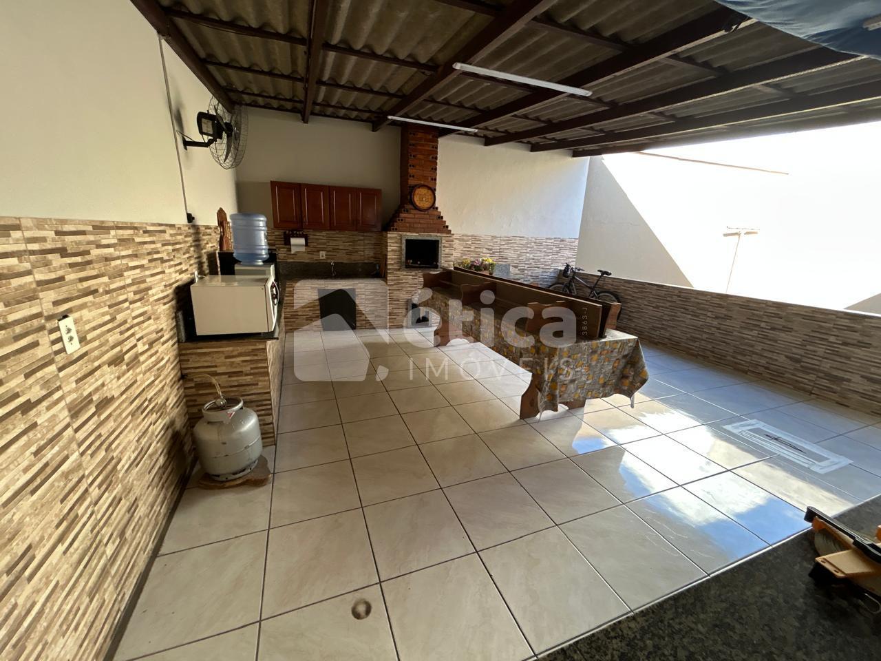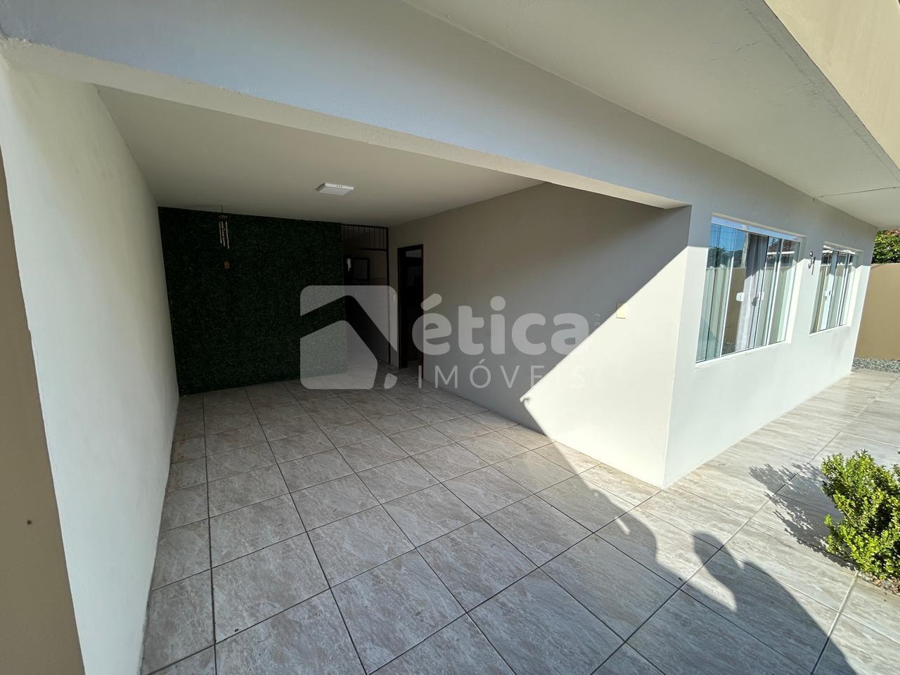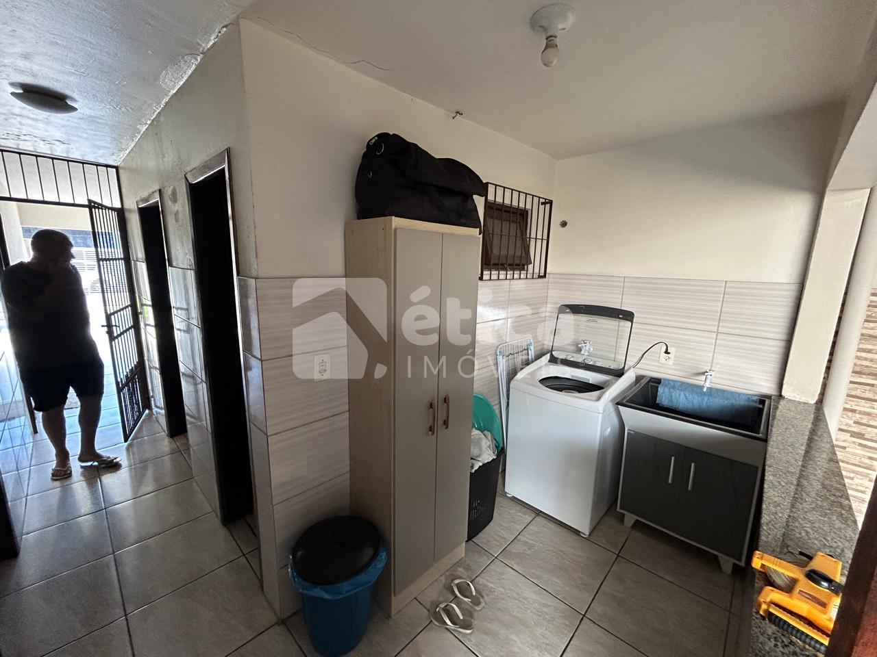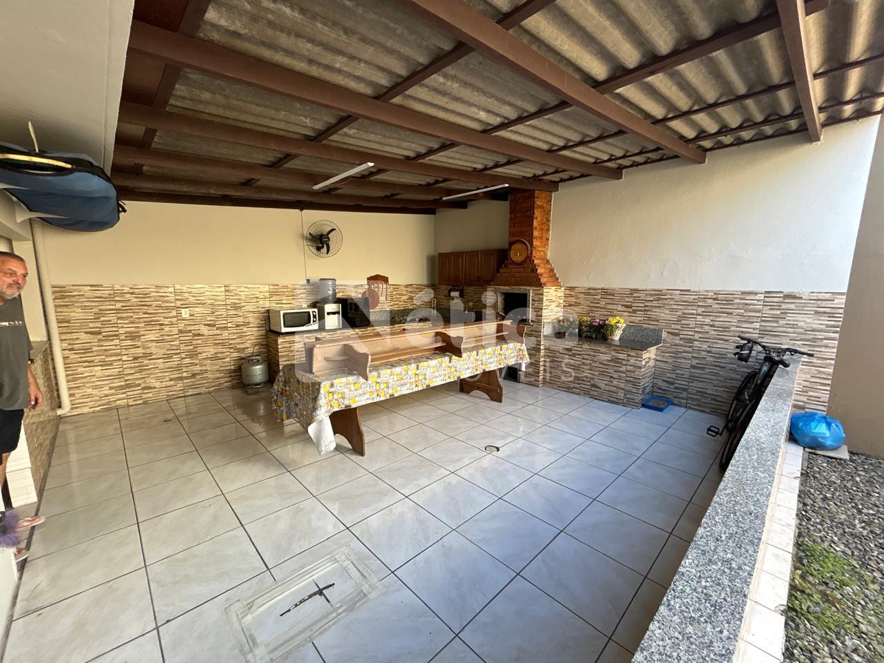 Construída em alvenaria com laje de concreto, a residência conta com três quartos, banheiro social, cozinha ampla, living integrado com salas de estar e jantar, lavanderia, depósito, espaço para três carros e uma generosa área de lazer coberta com churrasqueira e pia, totalizando 97,50 m² de área construída. Nos fundos, há um pátio perfeito para a construção de uma piscina.